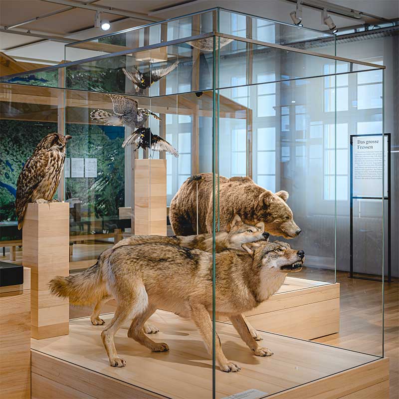 Unsere grössten einheimischen Beutegreifer sind Bär, Luchs und Wolf. Sie sorgen an der Spitze der Nahrungskette dafür, dass die Populationen der Pflanzenfresser reguliert werden und die Wälder gedeihen. Alle drei Grossraubtiere waren in der Schweiz ausgerottet. In dieser Führung wird den Schülerinnen und Schülern aufgezeigt, was zur Ausrottung geführt hat und wie sich ihre Rückkehr in die Schweiz gestaltet.